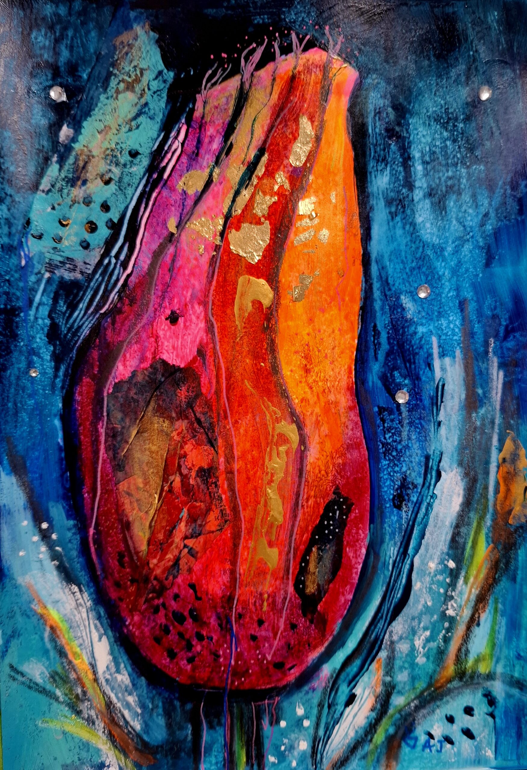 Acrylic & Mixed Media on paper with gold leaf and jewels. 20cm/29cm.